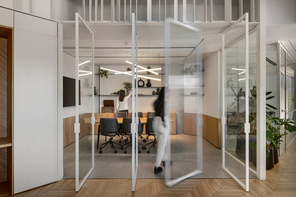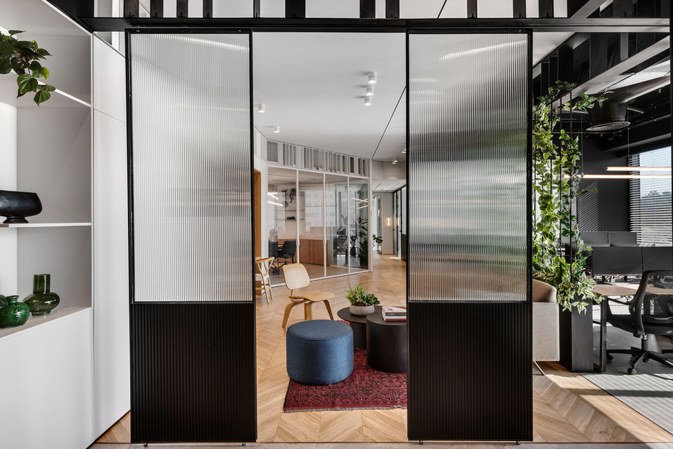 יצרנו קשרים בין פינת האוכל, פינות העבודה ופינת הישיבה על ידי הזזת מחיצות מתכת מזוגגות שהופכות את החיבורים בין האזורים לדינמיים, ומאפשרות לחללי המשרד להשתנות ללא הרף.
